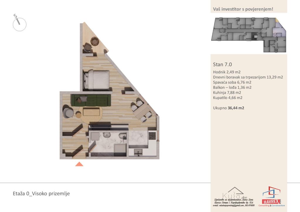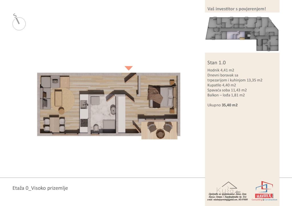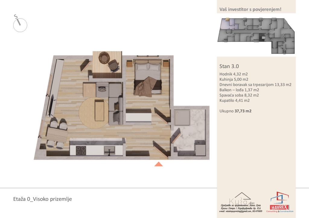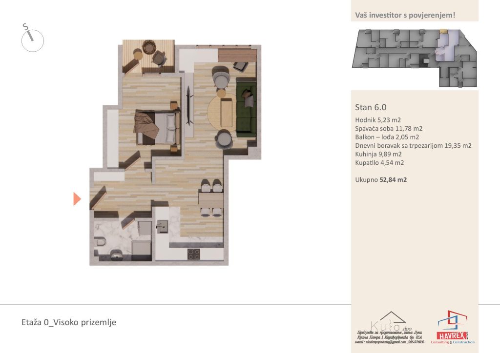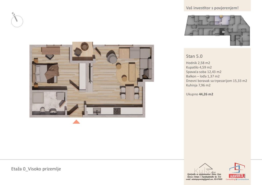 Za cijenu i dodatna pitanja, javite se na: Viber: +387 65 347 000 Email: havrex.nekretnine@gmail.com Etaža 0 - Visoko Prizemlje Etaže 1-4 Render stambenog objekta Vila Ksenija